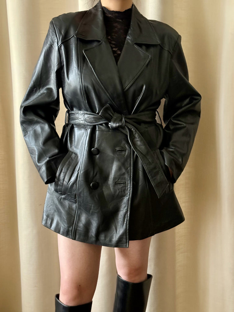 A classic 90s double-breasted leather jacket crafted in soft, supple leather that drapes beautifully on the body. Designed with a matching belt to cinch the waist, it creates a flattering silhouette and can be styled either as a jacket or worn fully buttoned as a statement leather dress. Features subtle line detailing on the pockets, adding structure without overpowering the design. Timeless, versatile, and effortlessly chic.