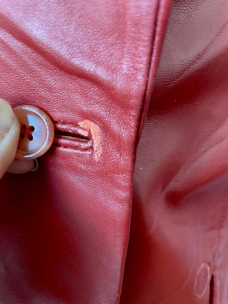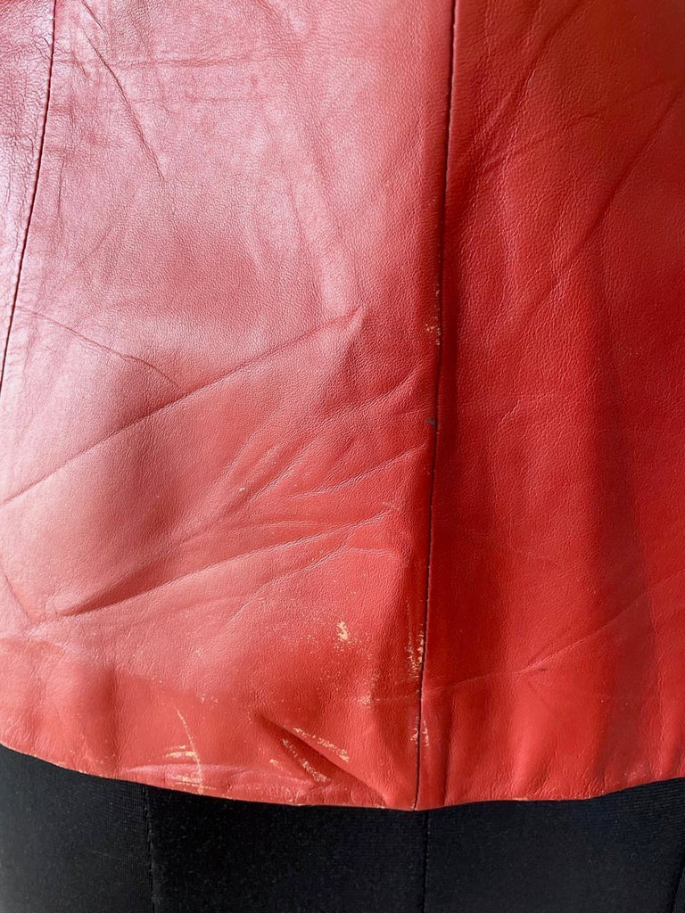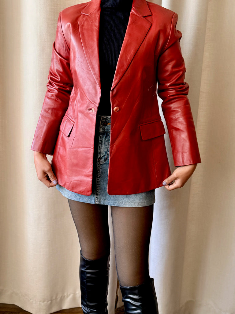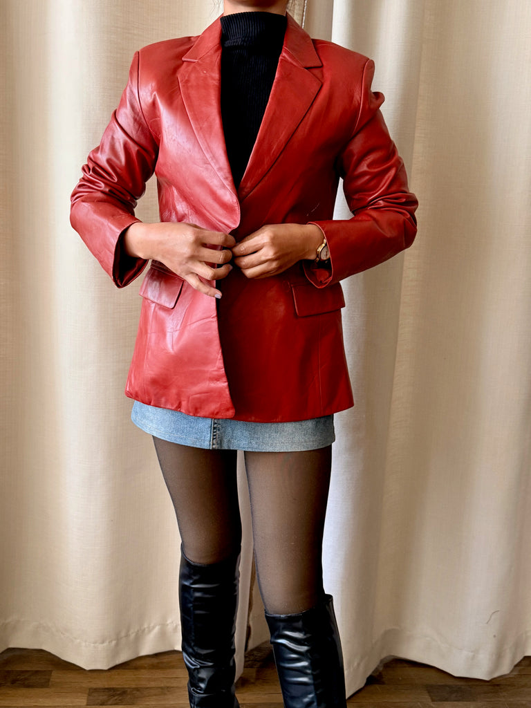 A ’90s snug-fit vintage leather blazer in a striking reddish-orange hue. Crafted from soft, genuine leather, this piece is designed to sit close to the body, making it a true statement while remaining timeless. Bold yet classic, it’s the kind of standout blazer that instantly elevates even the simplest look. A rare vintage find and a wardrobe hero you’ll keep coming back to.
