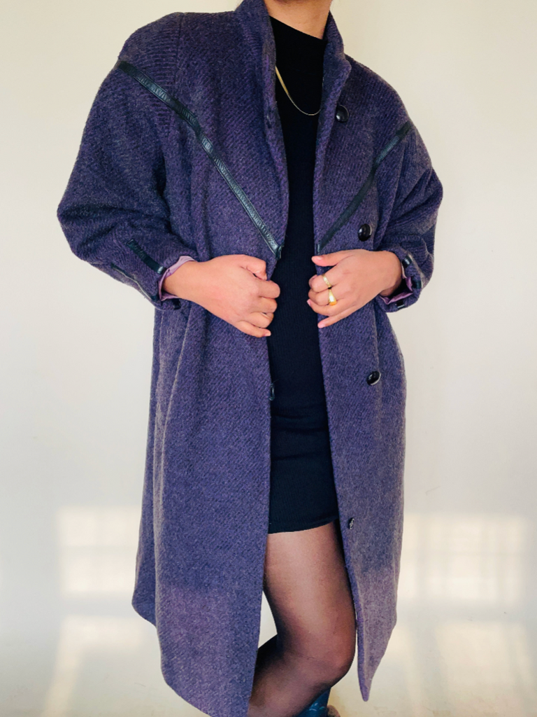 Vintage '80s wool over coat with drop shoulders and leather details.