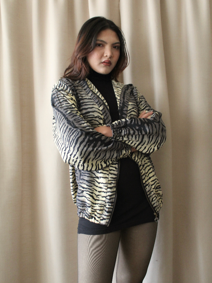 Vintage '90s animal print jacket with a chain enclosure. Features a hood and elasticated cuff and hem.