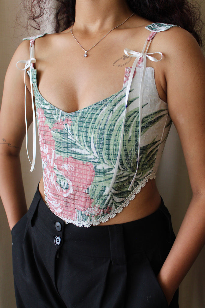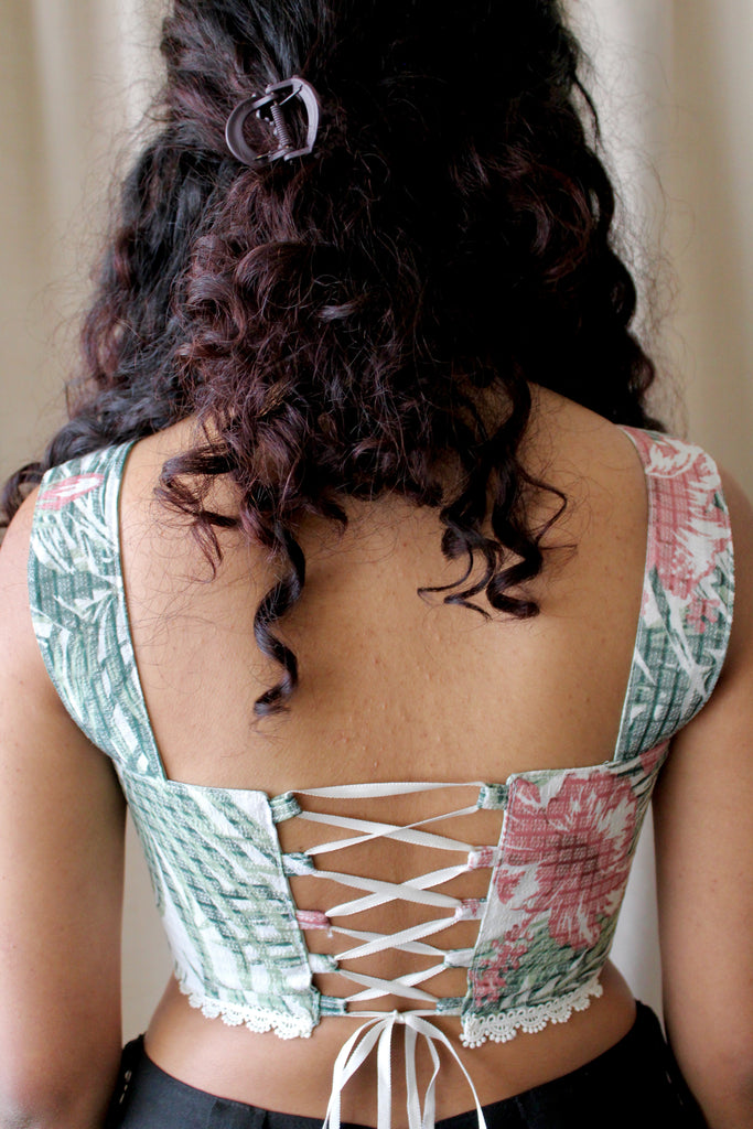 This corset has been reworked from a pre-loved pillow cover. Instead of being discarded into a landfill, the fabric has been given a new life through upcycling. Each stitch tells the story of its past while shaping it into a bold, modern silhouette. One-of-a-kind, sustainable, and crafted to last.