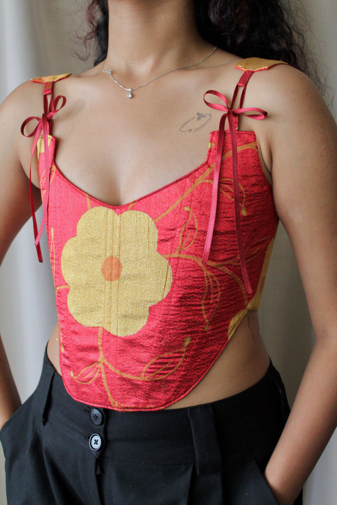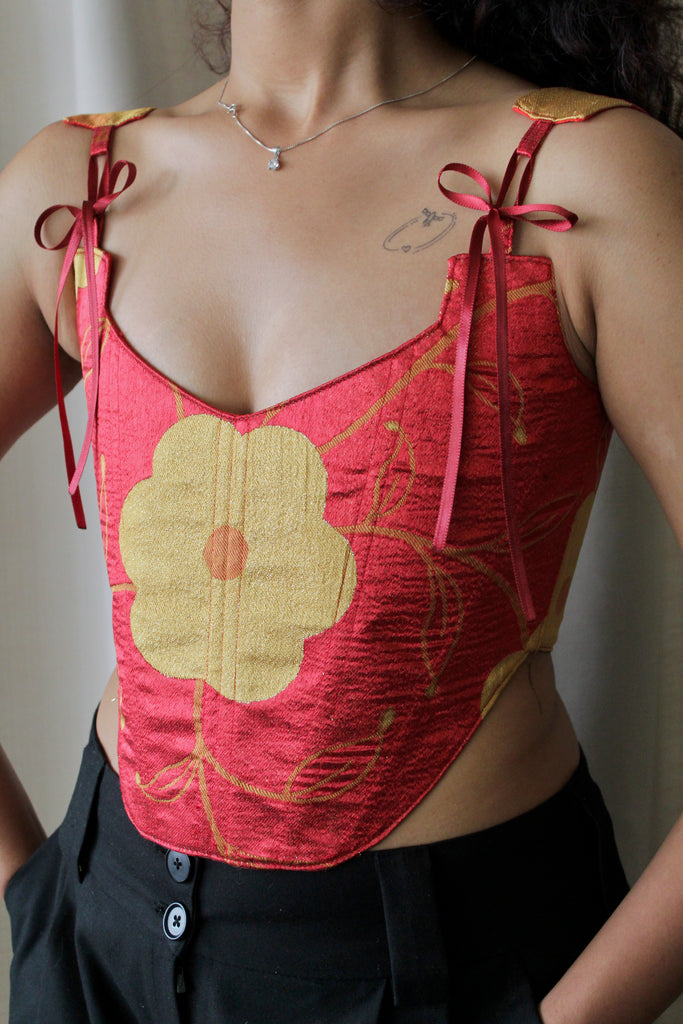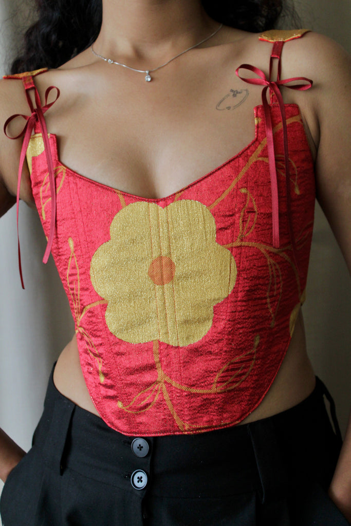This corset has been reworked from a pre-loved cushion cover. Saved from landfill, the fabric has been upcycled into a modern silhouette that carries its history into a new life. One-of-a-kind, handmade and crafted to last.