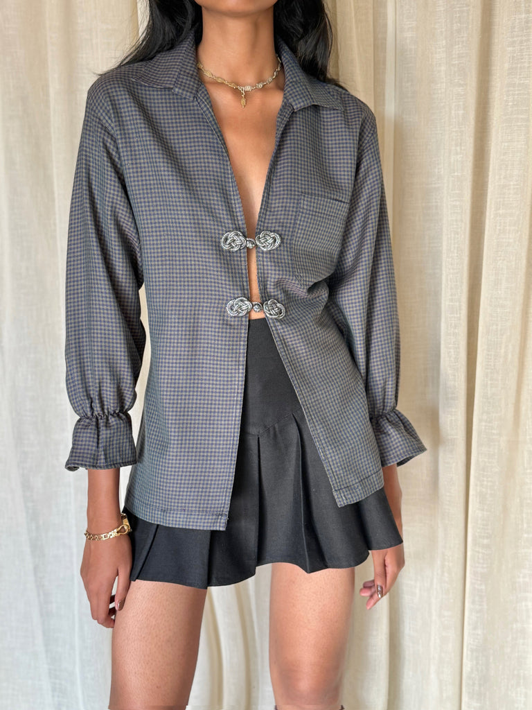 Each of these one-of-a-kind corset shirts begins life as a preloved men’s shirt that is carefully deconstructed, reshaped, and tailored into a waist-cinching silhouette that celebrates the contrast between classic tailoring and modern femininity. Finished with intricate hand-knotted Chinese buttons, the piece carries both heritage and edge — a refined statement in slow, considered fashion.