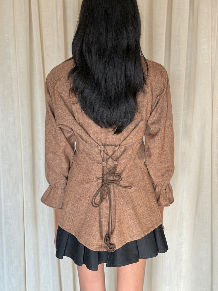 Each of these one-of-a-kind corset shirts begins life as a preloved men’s shirt that is carefully deconstructed, reshaped, and tailored into a waist-cinching silhouette that celebrates the contrast between classic tailoring and modern femininity. Finished with intricate hand-knotted Chinese buttons, the piece carries both heritage and edge — a refined statement in slow, considered fashion.