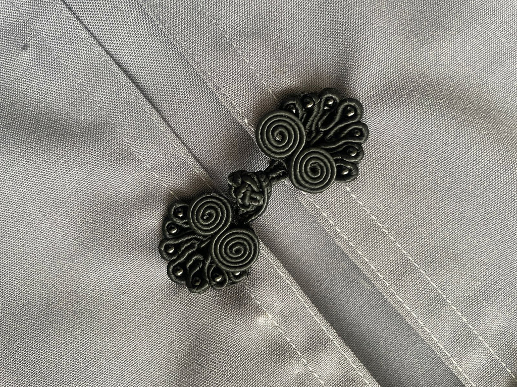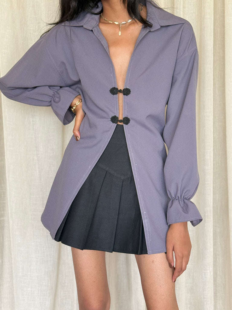 Each of these one-of-a-kind corset shirts begins life as a preloved men’s shirt that is carefully deconstructed, reshaped, and tailored into a waist-cinching silhouette that celebrates the contrast between classic tailoring and modern femininity. Finished with intricate hand-knotted Chinese buttons, the piece carries both heritage and edge — a refined statement in slow, considered fashion.