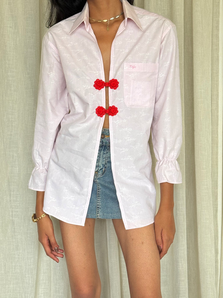 Each of these one-of-a-kind corset shirts begins life as a preloved men’s shirt that is carefully deconstructed, reshaped, and tailored into a waist-cinching silhouette that celebrates the contrast between classic tailoring and modern femininity. Finished with intricate hand-knotted Chinese buttons, the piece carries both heritage and edge — a refined statement in slow, considered fashion.