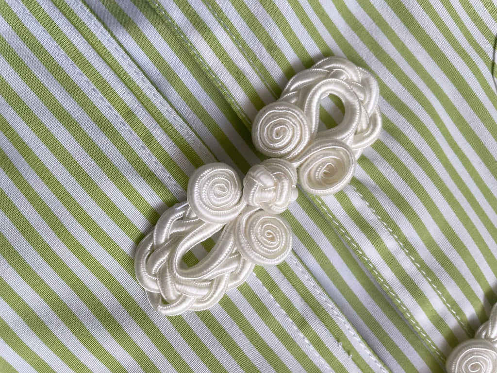 Each of these one-of-a-kind corset shirts begins life as a preloved men’s shirt that is carefully deconstructed, reshaped, and tailored into a waist-cinching silhouette that celebrates the contrast between classic tailoring and modern femininity. Finished with intricate hand-knotted Chinese buttons, the piece carries both heritage and edge — a refined statement in slow, considered fashion.